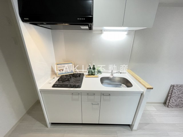 キッチンは2口コンロとスタイリッシュな仕様になっておりますが、上下に収納があり、リビングに干渉しない為広くご使用いただけます。カウンターキッチンとはまた違う良さがあり、リビングを広く活用することができる間取りです。白色で明るくシンクも広いので料理も捗る仕様です。