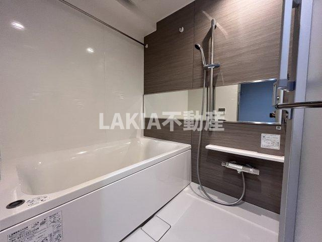 バスルームはシンプルな雰囲気になっておりシンプルなデザインにシックなアクセントパネルが目を惹く仕様になっておりまして、浴槽は広さもあり一日の疲れを癒せられるピッタリな空間となっております。また生活に欠かせない浴室乾燥機も導入されており、経済的に安心な追い炊き機能もございます。浴室への扉も折れ戸ではなく開き戸で、掃除面に関しても手入れしやすい設計になっております。