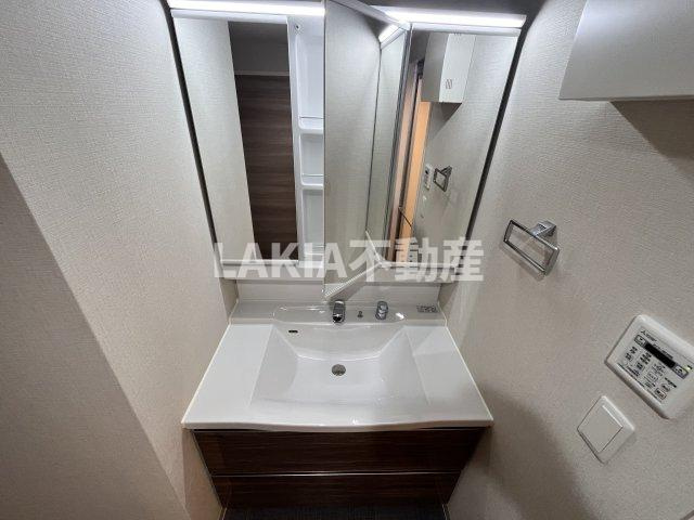 三面鏡になっており十分な収納力です。ヘアセットも捗ります。脱衣所自体も広く作られており、入居人数が多くて朝の時間帯に混雑するであろう脱衣所問題も解決です。また、近年人気のドラム式洗濯機でも設置できるくらいのスペースですのでご安心ください。