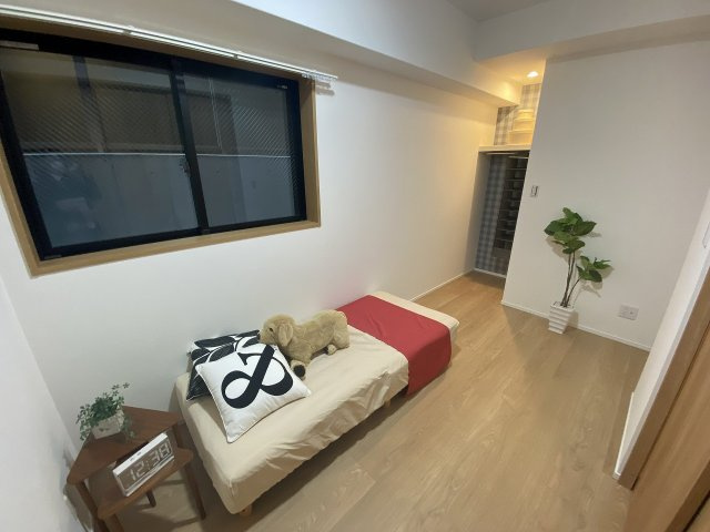 約5帖の洋室は、コンパクトながら居心地の良い空間で、プライベートルームや書斎、子ども部屋としても活用できます。奥には収納スペースを設けており、衣類や小物を整理整頓できるため、室内をすっきり保てます。家具の配置もしやすい整形の間取りで、ベッドやデスクを置いても圧迫感がなく、日常の暮らしに合わせた自由なレイアウトが可能です。自然光も取り入れやすく、明るく快適な室内で、落ち着いた時間を過ごせる洋室です。