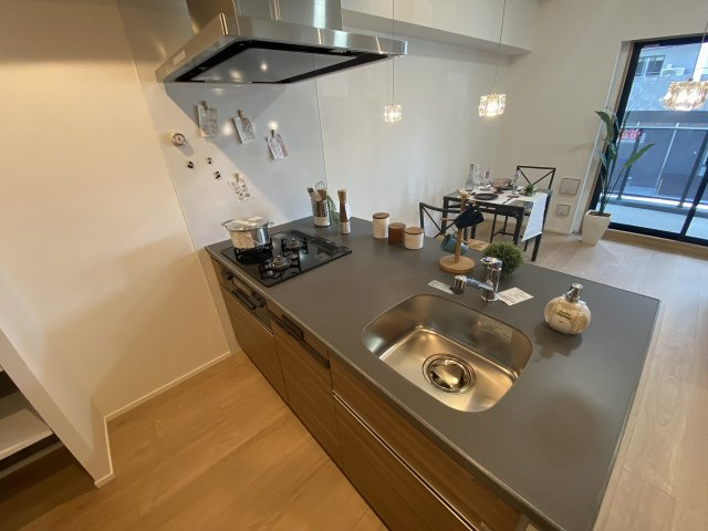 高級感あふれるカウンターキッチンは、リビングと一体感のある広々とした空間に設計され、家族との会話を楽しみながら調理ができます。3口ガスコンロを備えており、複数の料理を同時にスムーズに進められるため、日々の食事からおもてなしまで快適に対応可能です。カウンター越しに料理の様子を見渡せる設計で、リビングとのコミュニケーションも取りやすく、開放感と使いやすさを両立。作業スペースも十分に確保されており、収納も充実しているため、調理器具や食器類をすっきり整理できます。機能性とデザイン性を兼ね備え、上質な暮らしを演出するキッチンです。