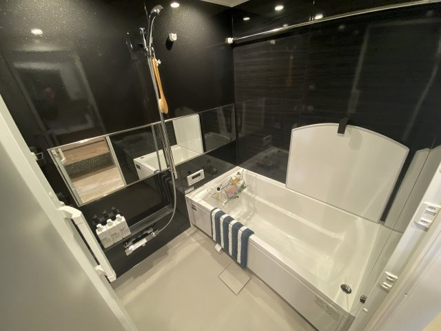 黒を基調としたバスルームは、重厚感と高級感を兼ね備えた上質な空間です。壁や浴槽にダークトーンを採用することで、落ち着きのあるラグジュアリーな雰囲気を演出し、まるでホテルのような贅沢なバスタイムを楽しめます。広々とした設計で、浴槽や洗い場のスペースに余裕があり、ゆったりと体を伸ばしてくつろげるのも魅力です。照明や鏡の配置によって空間に奥行きと明るさをプラスし、快適性も確保。機能性にも配慮されたデザインで、日常の疲れを癒すリラックス空間として、上質でスタイリッシュなバスルームを実現しています。