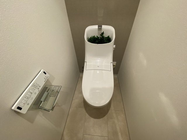 大きな2面鏡を備えた洗面スペースは、使いやすさと収納力を兼ね備えた快適な空間です。左右に広がる鏡により、角度を変えて全身やヘアスタイルを確認でき、朝の身支度がスムーズに行えます。鏡裏には収納スペースを豊富に設け、化粧品や歯ブラシ、洗面用品などを整理整頓できるため、カウンター周りをすっきり保てます。また、広めのカウンターは作業スペースとしても余裕があり、複数人で同時に使用しても窮屈さを感じません。収納力と機能性を両立させた設計で、毎日の身支度を快適にサポートする洗面空間です。スタイリッシュなトイレは、シンプルで洗練されたデザインが魅力。コンパクトながら使いやすく、清潔感あふれる空間で快適な毎日をサポートします。